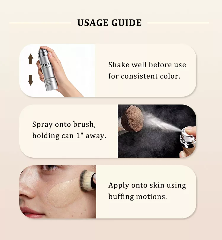 ສັ່ນສະເປສີດໃຫ້ລະອຽດກ່ອນໃຊ້ ເພື່ອຮັບປະກັນວ່າສູດສີດຮອງພື້ນ Wilson breathable breathable breathable long-lasting hydrating foundation ແມ່ນປະສົມຢ່າງເທົ່າທຽມກັນ. ຖືກະປ໋ອງໄວ້ຫ່າງຈາກໃບໜ້າປະມານ 15-20 ຊັງຕີແມັດ ແລະສີດໃສ່ຜິວໜັງທີ່ສະອາດ, ແຫ້ງ, ຫຼີກເວັ້ນບໍລິເວນຕາ, ດັງ ແລະ ປາກ. ຫຼັງຈາກສີດແລ້ວ, ໃຊ້ປາຍນິ້ວເບົາໆ ຫຼື ປ່ອຍໃຫ້ພື້ນຜິວແຫ້ງຕາມທຳມະຊາດ ເພື່ອໃຫ້ພື້ນຜິວຕິດສະໜິດສະເໝີ, ເຮັດໃຫ້ມີນ້ຳໜັກເບົາ, ເປັນທຳມະຊາດ. ສໍາລັບການປັບປຸງການຄຸ້ມຄອງຫຼືຜົນໄດ້ຮັບທີ່ຍາວນານ, ສະຫມັກໃຫມ່ຕາມຄວາມຕ້ອງການ. ຮັບປະກັນການລະບາຍອາກາດທີ່ພຽງພໍໃນລະຫວ່າງການໃຊ້ ແລະຫຼີກເວັ້ນການຫາຍໃຈເອົາສີດ.